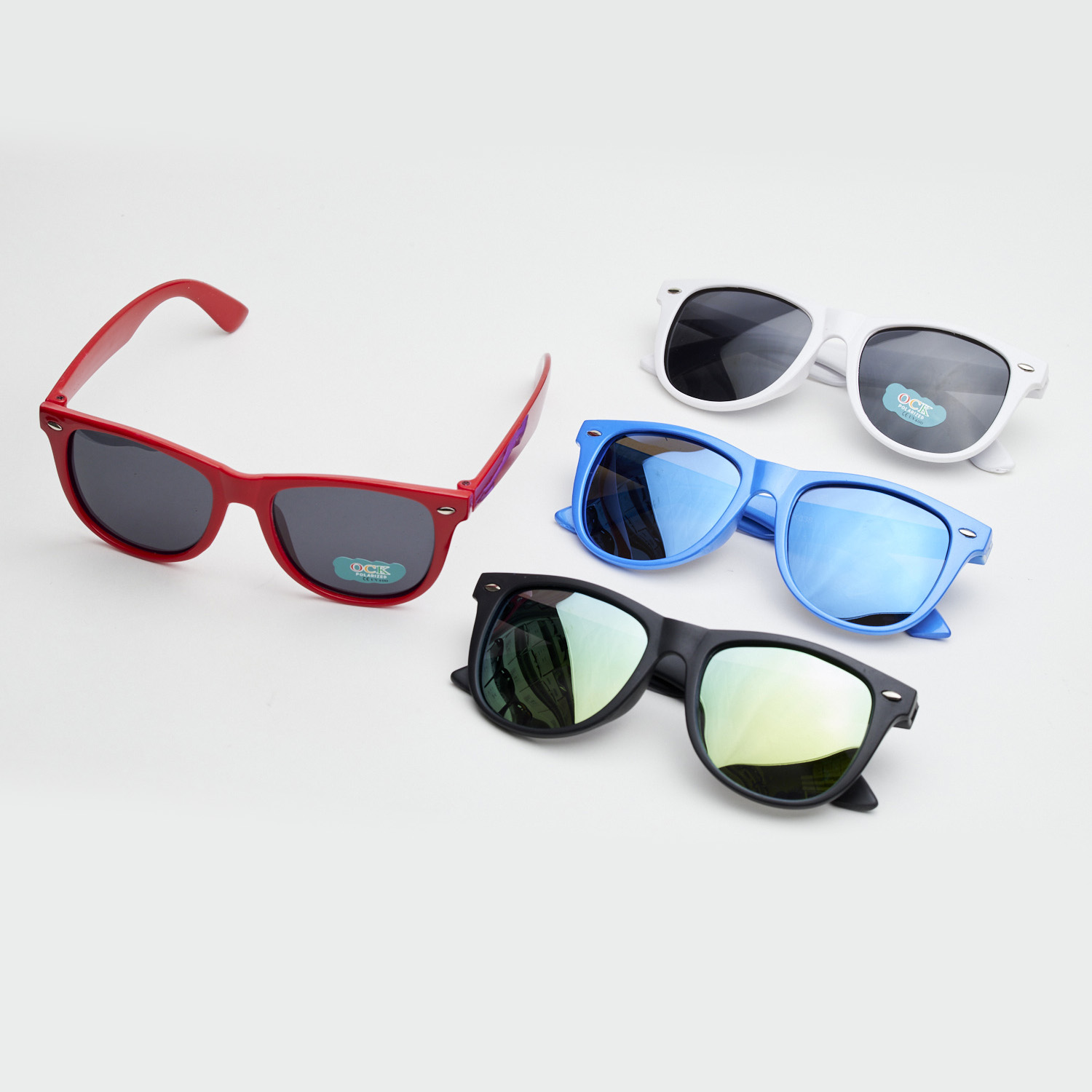 Очки детские солнцезащитные OCK PK038 – это великолепный аксессуар для мальчиков и девочек в летний сезон. Очки оснащены прочным шарнирным механизмом складывания дужек оправы. Данная модель очков продаётся упаковкой по 4 штуки разных цветов: голубой, черно-красный, черно-белый, черно-изумрудный.